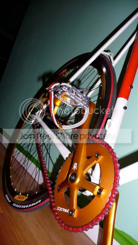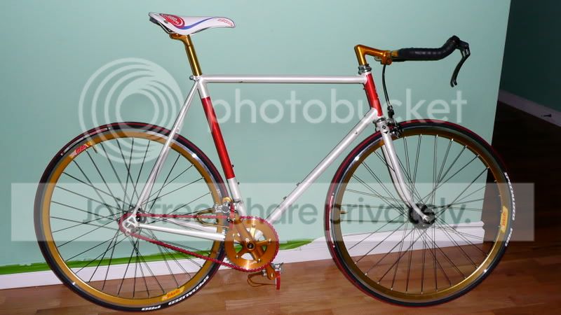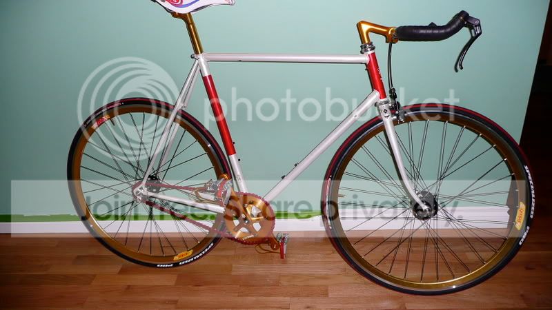 this is my first fixie. i love the frame and am enjoying learning how to ride fixed. the post, stem, and bars are nitto gold. the wheels are velocity deep v's on paul high flange (flip flop - just in case!). crank is kyotoloco with matching gold cages. i have gold pedals, but i can't find straps thin enough to go through them... any ideas on that? i'm gonna rewrap the bars with white to add a bit more cushion, but other than that the bike looks, rides, and feels SWWWEEEEEEEEEEET!!!