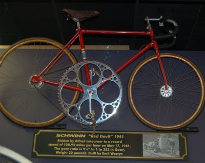 edit: in the pic with the red Schwinn you can see a picture of the apparatus in the placard underneath the bike... and I was mistaken; it's not a motorcycle... it's a race-car.