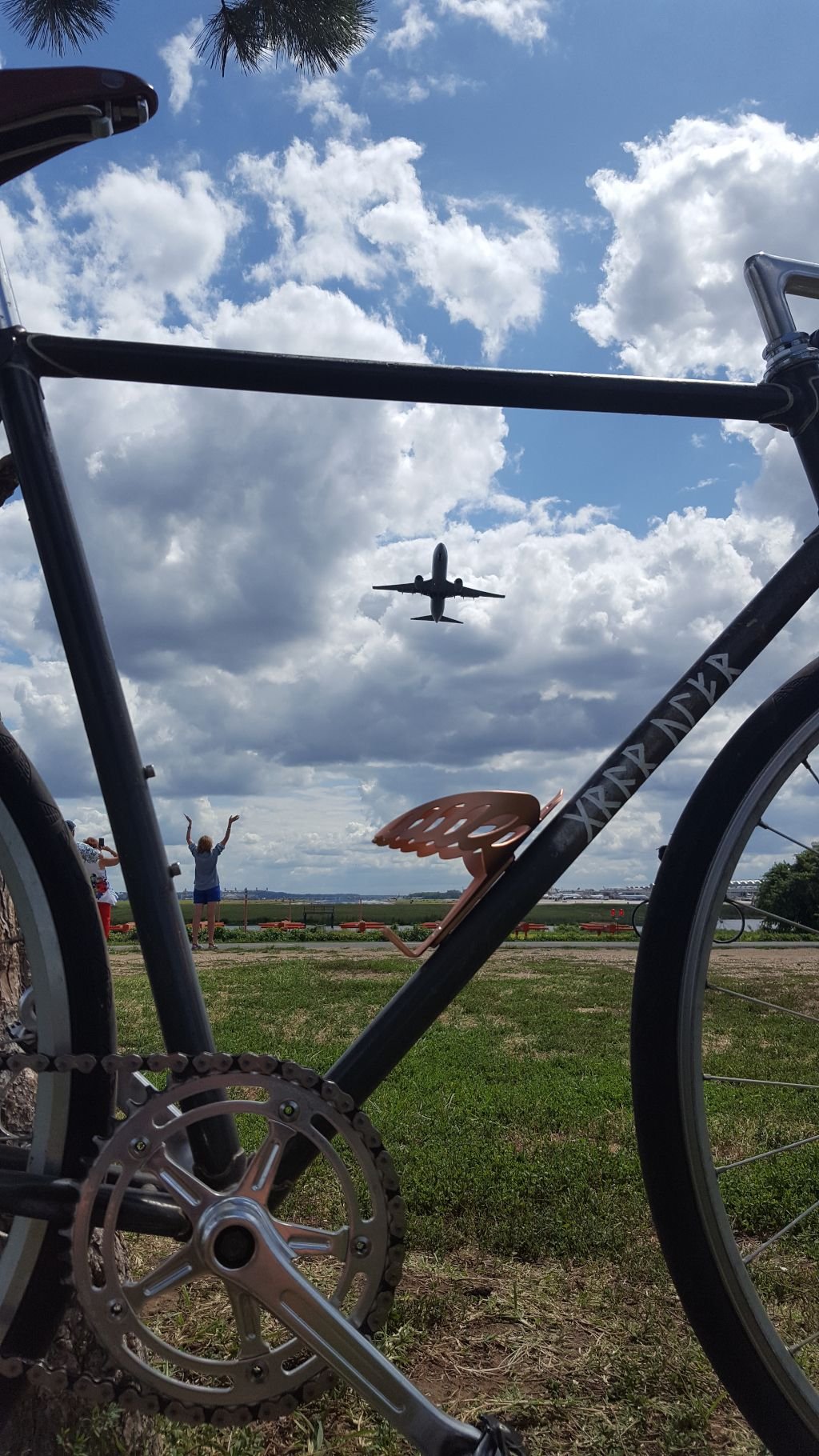 Edit: I have only 5 posts so here is a description of the picture: an airplane is directly over head, just having taken off from the runway in the distant background. There are no bikes. |